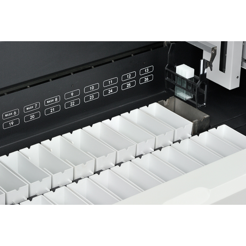 染色站點(diǎn)數(shù)量 總站點(diǎn)數(shù)26個(gè),(含試劑站點(diǎn)17個(gè),水洗站點(diǎn)4個(gè),烤缸1個(gè),加載/卸載站點(diǎn)≥4個(gè)(智能配置,其中2個(gè)缸可設(shè)置為試劑缸) |